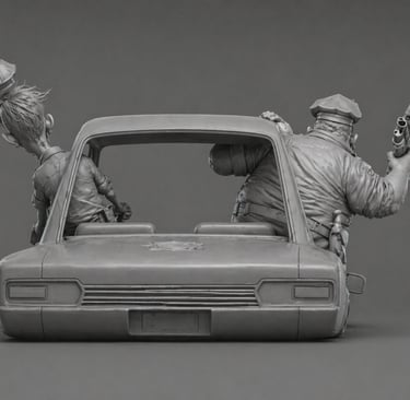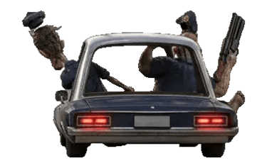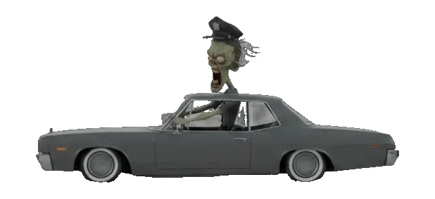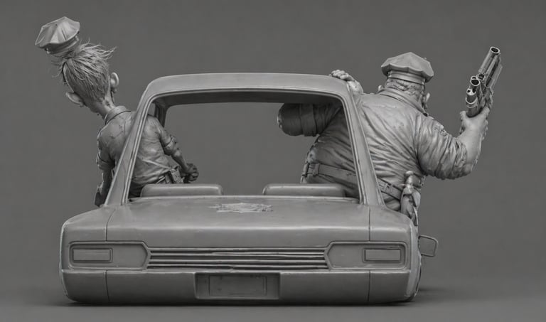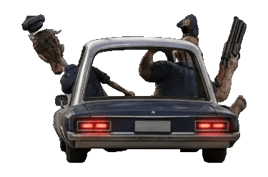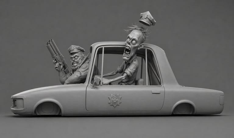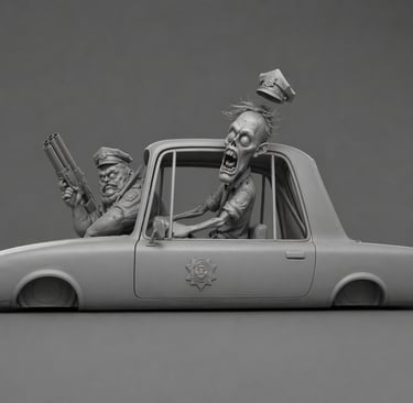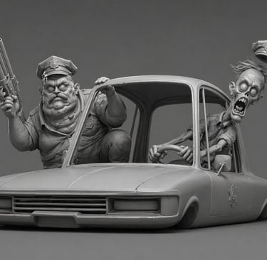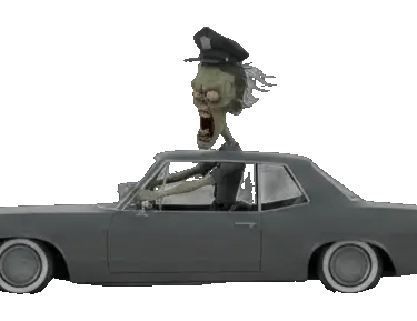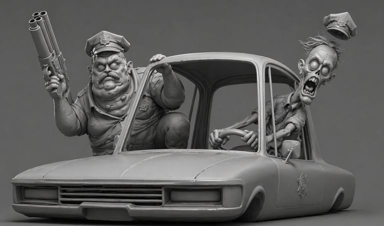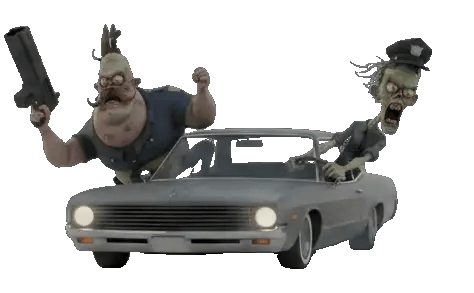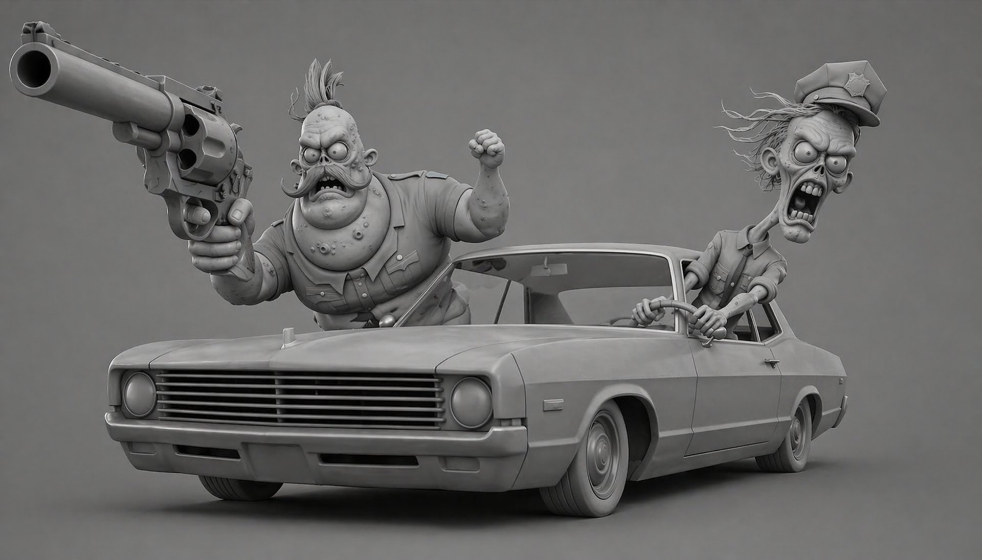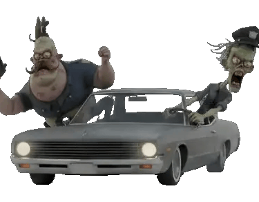Two zombie police officers inside a moving lowrider car, speeding forward in a chase. Both characters are leaning out of the car windows. Strong sense of motion, wind, and instability.
